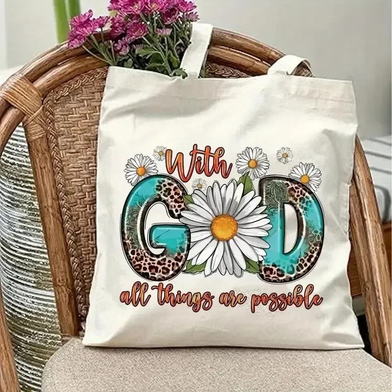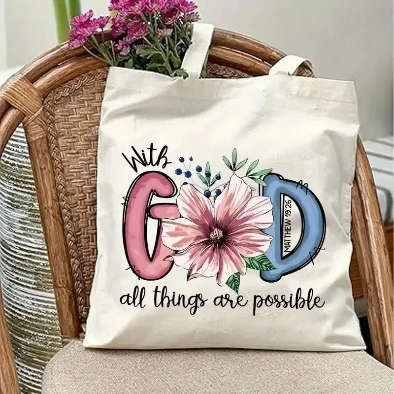 This God Is Good canvas tote bag features an uplifting Bible verse design. The message reminds you that all things are possible through faith. Made from durable canvas, it is built for everyday use. The shoulder straps provide comfortable carrying throughout the day. Its spacious interior holds books, groceries, or daily essentials with ease. Perfect for church, Bible study, or errands. The inspirational print makes a bold yet meaningful statement. This tote blends practicality with Christian encouragement. Suitable for casual outfits and daily routines. It is lightweight yet strong enough for regular use. This bag makes a thoughtful gift for women of faith. It beautifully combines scripture, style, and functionality.