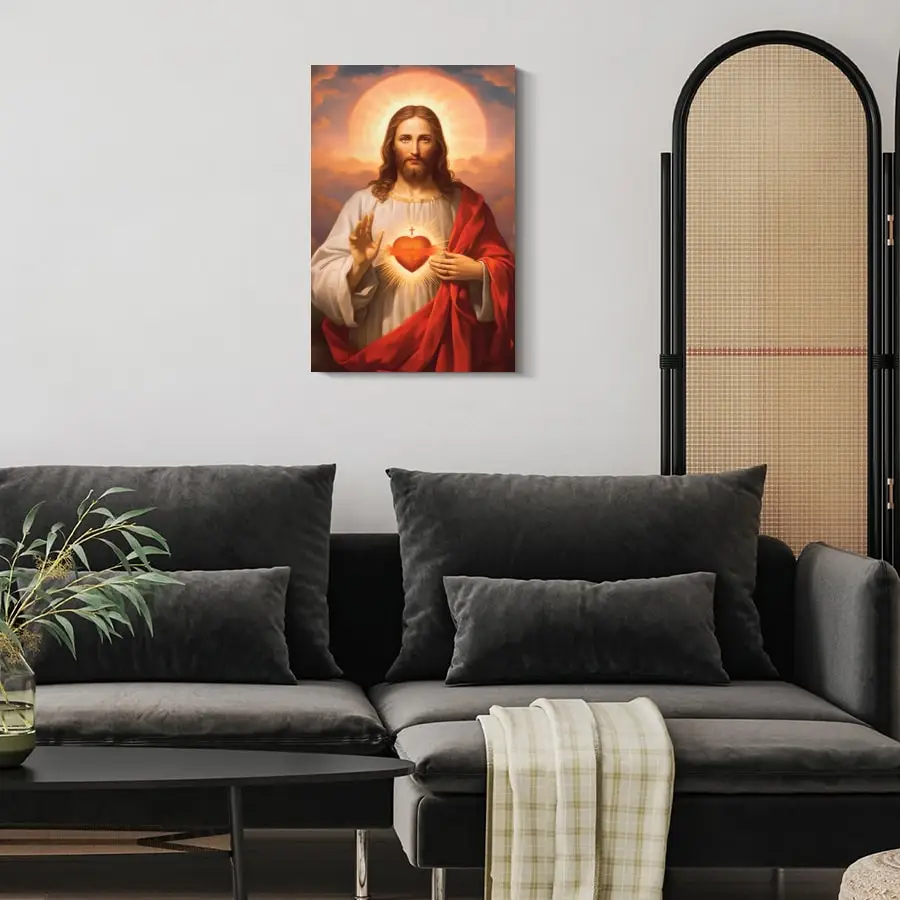 This framed canvas wall art features the Sacred Heart of Jesus and Divine Mercy portrait. The artwork beautifully represents love, mercy, and devotion. Printed on high-quality canvas, it offers rich color and clear detail. The framed design makes it ready to hang in any space. Perfect for living rooms, bedrooms, or prayer areas. This piece creates a peaceful and faith-filled atmosphere. The sacred imagery encourages reflection and prayer. Its timeless design complements both traditional and modern décor. The durable canvas ensures long-lasting beauty. Ideal for Catholic and Christian homes. This wall art makes a meaningful gift for religious occasions. It brings faith, inspiration, and reverence into your home.