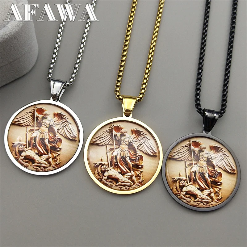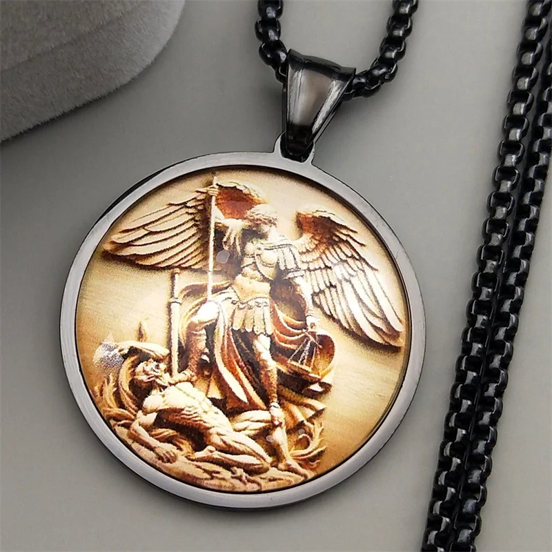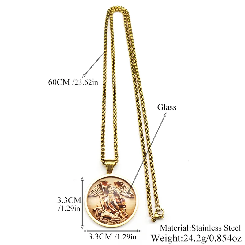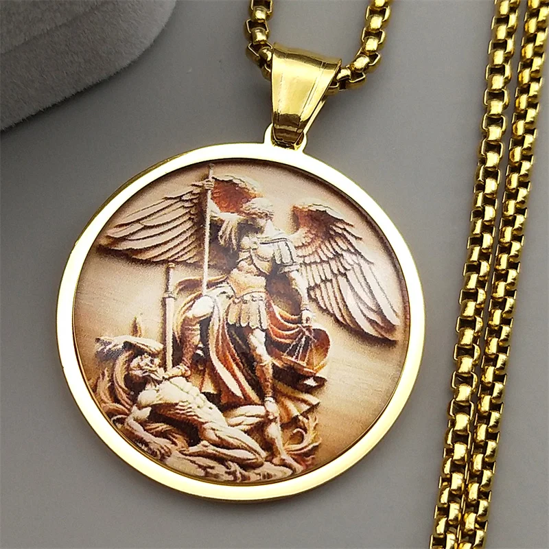 This Archangel Saint Michael pendant necklace features a round stainless steel charm with a striking gold finish, designed for both men and women. Perfect for daily wear or as a meaningful religious gift, it symbolizes protection, faith, and devotion. The durable chain ensures long-lasting comfort and style. A timeless accessory for anyone seeking a connection to their faith and guardian angel.