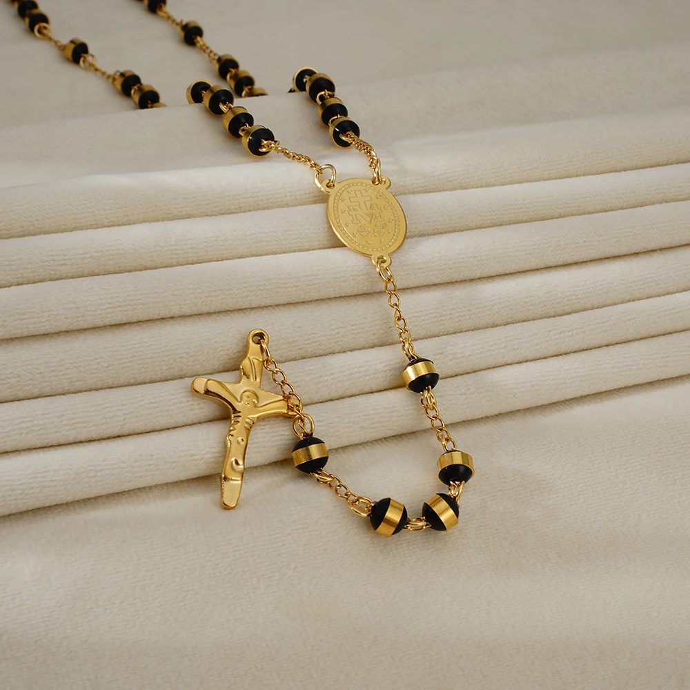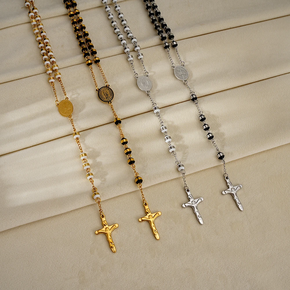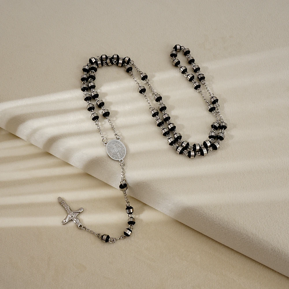 This stainless steel rosary necklace features classic white and black beads. The design includes a detailed Virgin Mary centerpiece and Jesus crucifix. Made from durable stainless steel, it resists tarnishing and wear. The beads are smooth and comfortable for prayer or daily wear. This rosary serves as both a devotional tool and a meaningful necklace. Its timeless design reflects strong Catholic tradition. Suitable for men and women of faith. Ideal for prayer, meditation, or spiritual reflection. The sturdy construction ensures long-lasting use. This rosary necklace can be worn or kept for personal devotion. It makes a thoughtful gift for baptisms, confirmations, or religious occasions. This piece beautifully combines faith, durability, and spiritual significance.